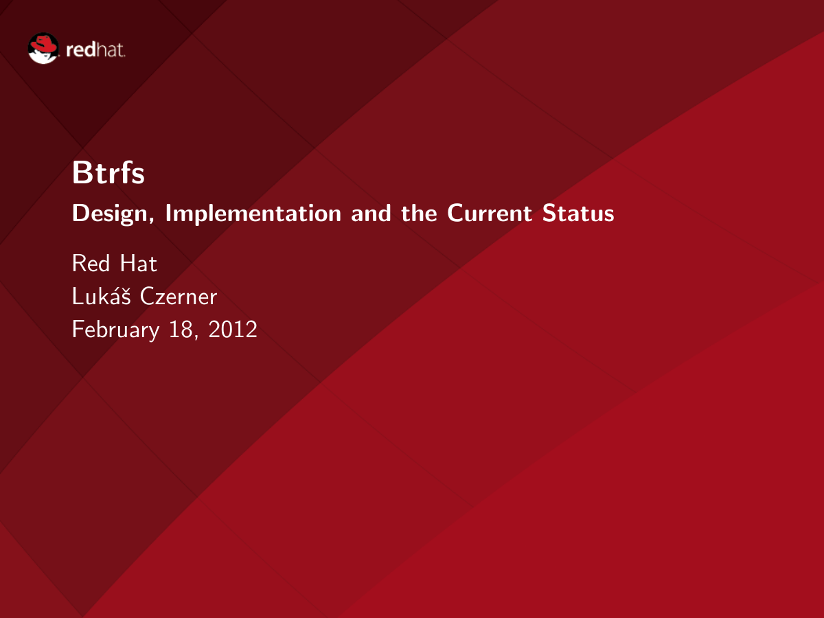 Technical presentation examines design and implementation of Btrfs file system in the Linux kernel.