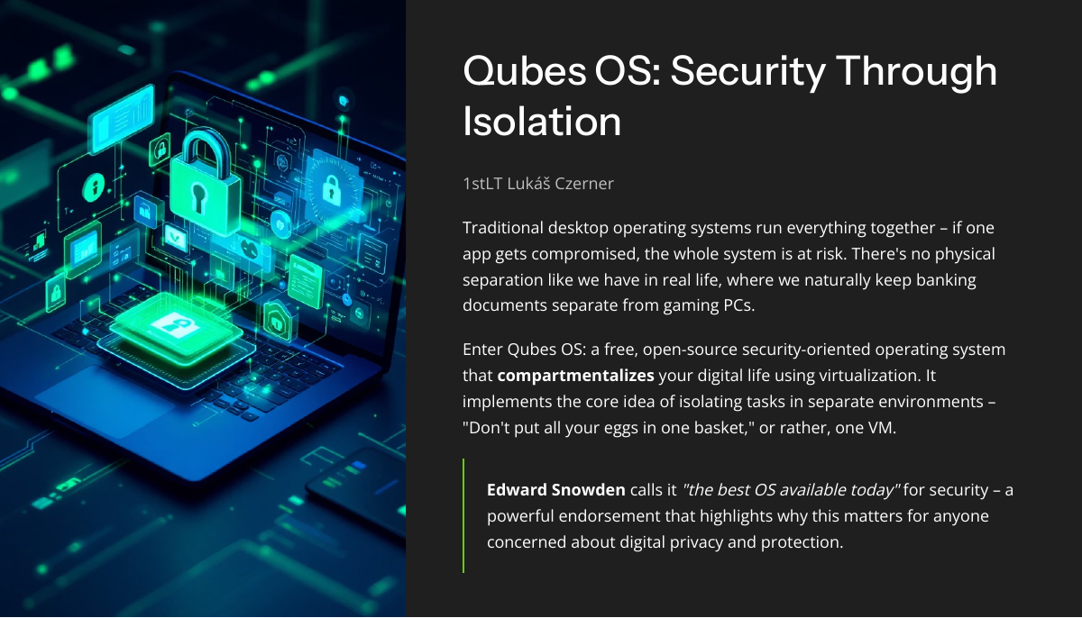 Qubes OS achieves robust security through virtualization-based compartmentalization, isolating different tasks in separate virtual machines to prevent a single compromise from affecting the entire system.